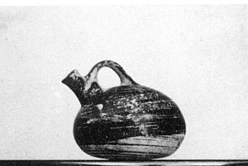 Description:   Complete except for chip from spout and one body fragment. Squat body, shallow convex on bottom, slightly pointed toward top. Diagonally upwards pointed spout; strap handle. On the lower part the thin streaky glaze forms a spiral, starting from the middle of the bottom.