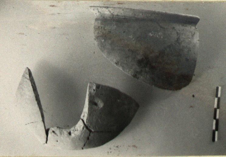 | Description: | Two non-joining fragments, one from the upper body and rim, the other (much mended) from lower body. Outward turned rim. Buff clay with grits; unglazed. | |