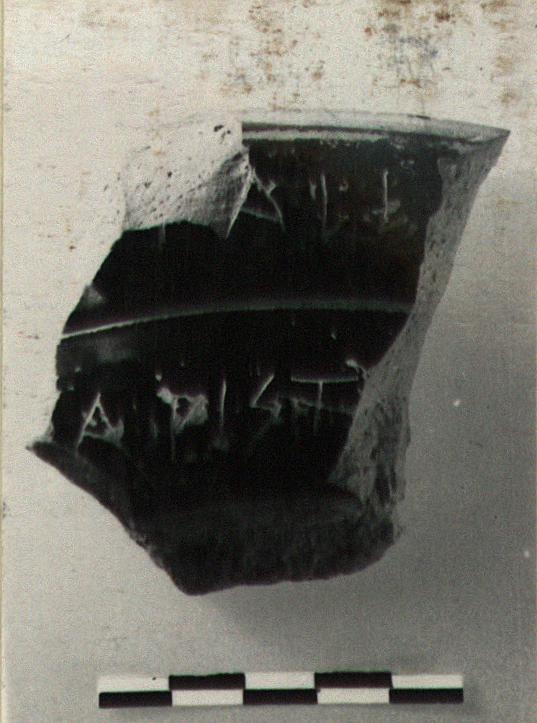 | Description: | From the base of a krater with double torus moulding. Black glaze. Incised on upper face: <graphic> Joins P 19209 (joined) and P 22992 (two ostraka from the same pot). | |