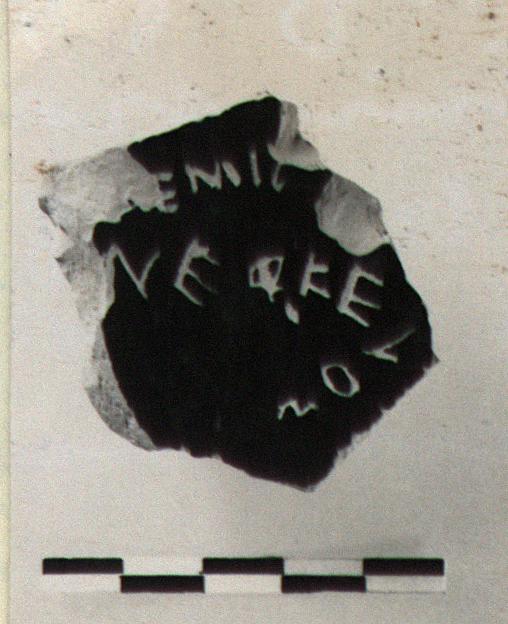 | Description: | Part of the floor and stem of a black glazed kylix. Incised on the floor: <graphic> | |