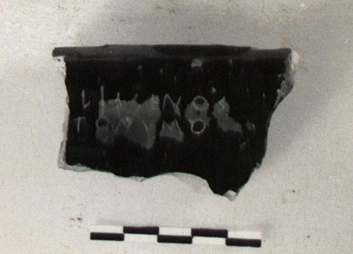 | Description: | From the rim and upper wall of a krater(?) with out-turned rim. Firm dull black glaze inside and out, and a purple band. Upper face of rim unglazed. Incised inside: <graphic> | |