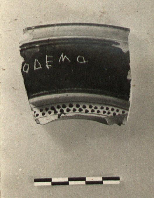 | Description: | Fragment of rim, with start of floor. Broad rim, black glazed, slightly convex on top; around its edge a reserved band between two lightly moulded ridges; this band and the unglazed underside reddened. Floor offset from rim; creamy ground, with a double row of glaze dots between two narrow lines around its outer edge. Incised on rim through glaze: <graphic> | |