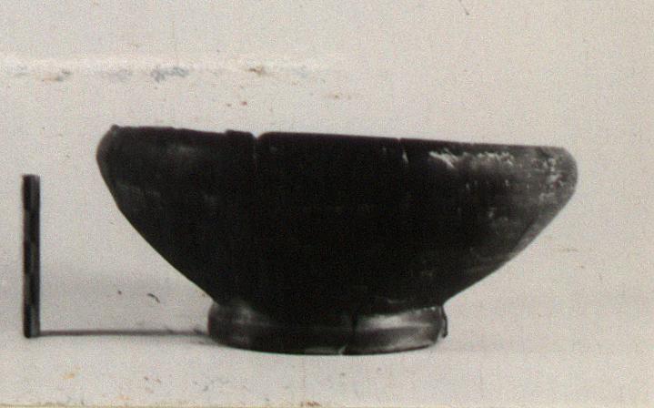 | Description: | Complete except for chips. Ring foot; flaring walls; sharply inturned rim. Glazed over all; the glaze mostly fired red. | |