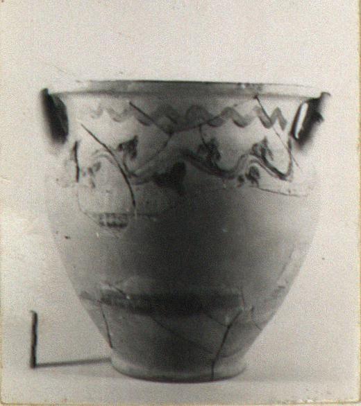 | Description: | Parts of rim and walls missing and restored. Ring foot; deep egg-shaped body; wide short neck forming continuous curve with body; rolled horizontal handles attached at base of neck and rising to rim. Lip flat on top. The top of the lip glazed; decoration in thin brown: around the neck, wavy line; around the shoulder, ivy wreath; around the body, two bands. Pinkish-buff clay with creamy slip, worn. | |
