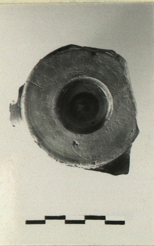 | Description: | Base of a black glaze bowl or stemless cup; disk foot, with depressed center. Reserved, a band around the top of the foot; the resting surface, reddened; and a band around the edge of the depression. Stacking line on floor inside. Incised on underside of foot: <graphic> | |