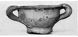 | Description: | Intact except for small chip from lip. Roughly wheelmade. Low raised base, left very rough beneath. Upper body slightly concave, to flaring rim. Vertical band handles from rim. Pinkish-buff clay, unglazed. | |
