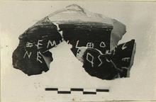 | Description: | Mended from five pieces. Fragment of neck of column krater, black glazed except under rim (broken off); purple line at inner edge of lip. Incised outside: <graphic> | |