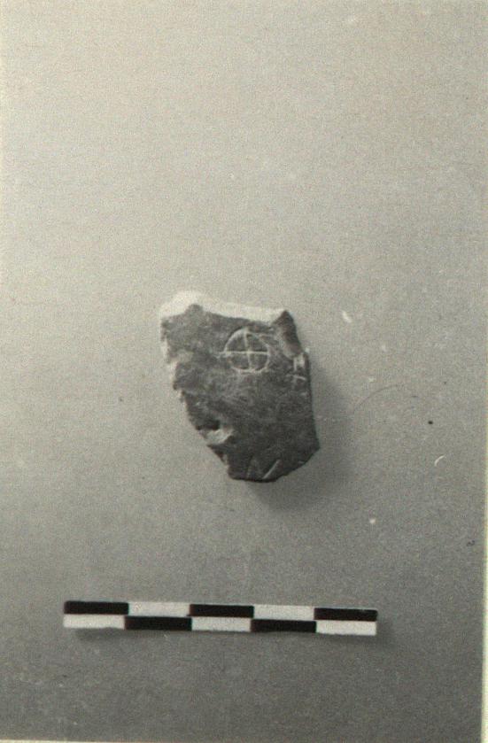 | Description: | Wall fragment from semi-glazed jug(?). Incised outside: <graphic> Inside unglazed; outside, thin brown wash. | |