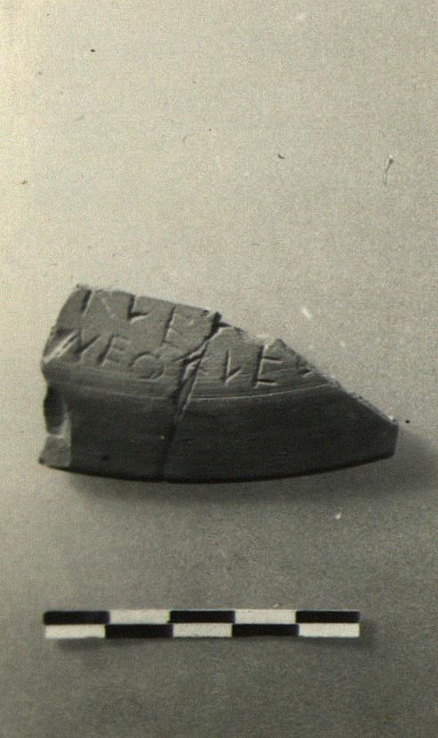 | Description: | Mended from two fragments. From a clay ring, turning up towards inner edge (not present). Incised underneath: <graphic> Fine light red clay, surfaced with buff on top. | |