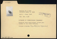 | Description: | Fragment from semi-glazed closed pot; traces of thin wash outside. Incised outside: <graphic> | |