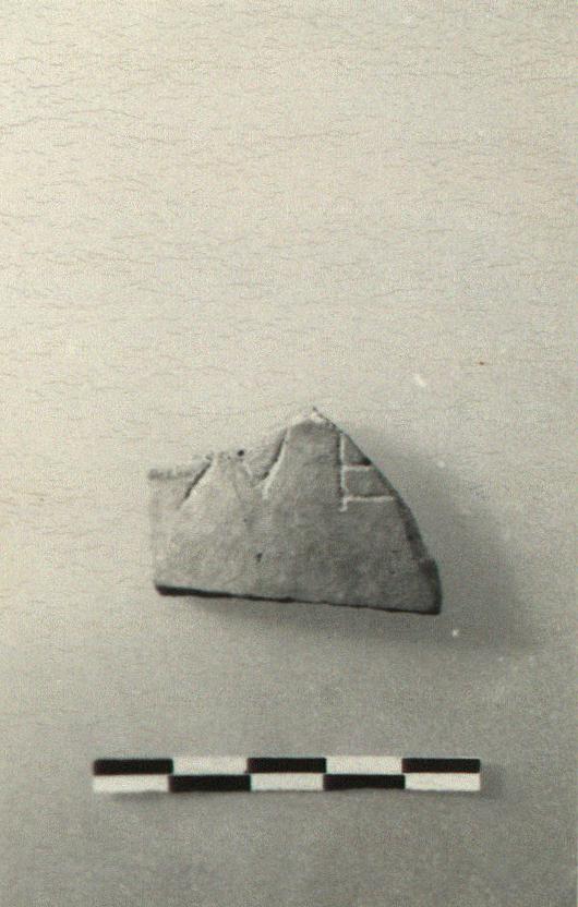 | Description: | Fragment from plain pot. Incised outside: <graphic> Clay brown at surfaces; within, half gray, half red. | |