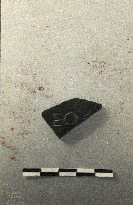 | Description: | Small piece of plain pot. Incised outside: <graphic> Clay gray at core and outer surface; red at inner surface. | |