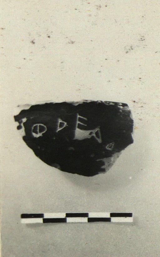 | Description: | Rim fragment from black glazed one-handler. Incised outside: <graphic> | |