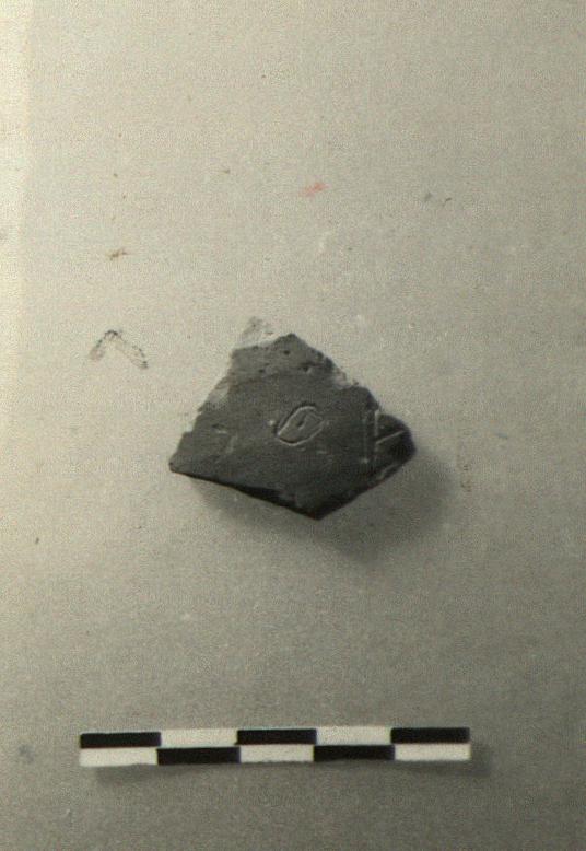 Description:   Small fragment from thin-walled pot; semi-glazed oinochoe? Traces of glaze wash and band outside.