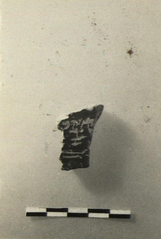 | Description: | Wall fragment from semi-glazed krater. Incised inside: <graphic> Glaze greenish-brown inside; thin wash and brown band outside. | |
