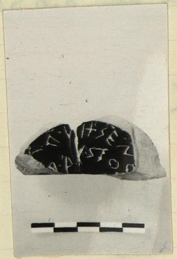 | Description: | Mended from two pieces. Foot of black glazed kylix, torus edge reserved. Incised beneath: <graphic> | |
