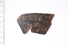 | Description: | Mended from two pieces. Fragment of large closed pot, black glazed, chipped, outside only. Incised outside: <graphic> | |