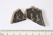 | Description: | Mended from two pieces. Wall fragment of a large open pot. Incised inside: <graphic> Good black glaze inside; fired greenish to red outside. Dented in making. b) Wall fragment, glazed black inside and out. Apparently from the same pot as a), but does not join. Possibly a different ostrakon? Inscribed inside. | |