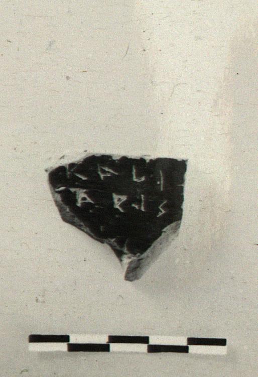 | Description: | From a semi-glazed krater. The fragment nearly flat. Incised on glazed side: <graphic> Black glaze on one side; thin wash and broad black band on the other. | |