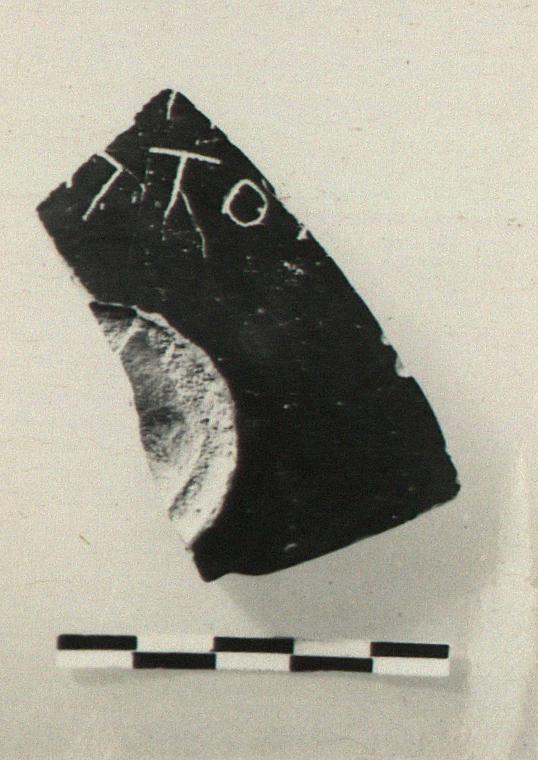 | Description: | Floor with part of stem attachment of a black glazed kylix. Good glaze. Incised outside: <graphic> | |