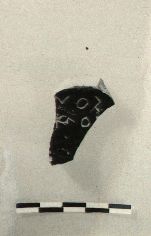 | Description: | Wall fragment from semi-glazed one-handler; black inside and for band outside. Incised inside: <graphic> | |
