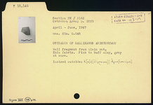 | Description: | Wall fragment from plain pot. Incised outside: <graphic> Thin fabric. Pink to buff clay, gray at core. | |