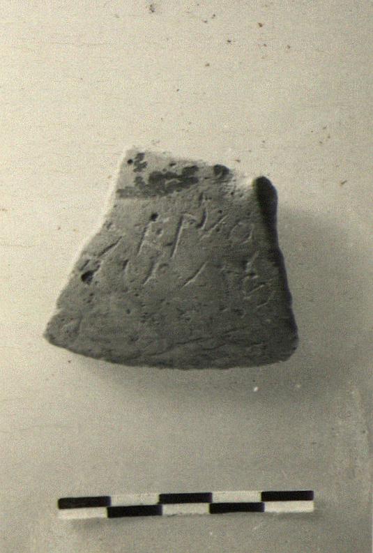 | Description: | Wall fragment from semi-glazed krater. Incised outside: <graphic> Red wash, much worn, inside; and for band outside. | |