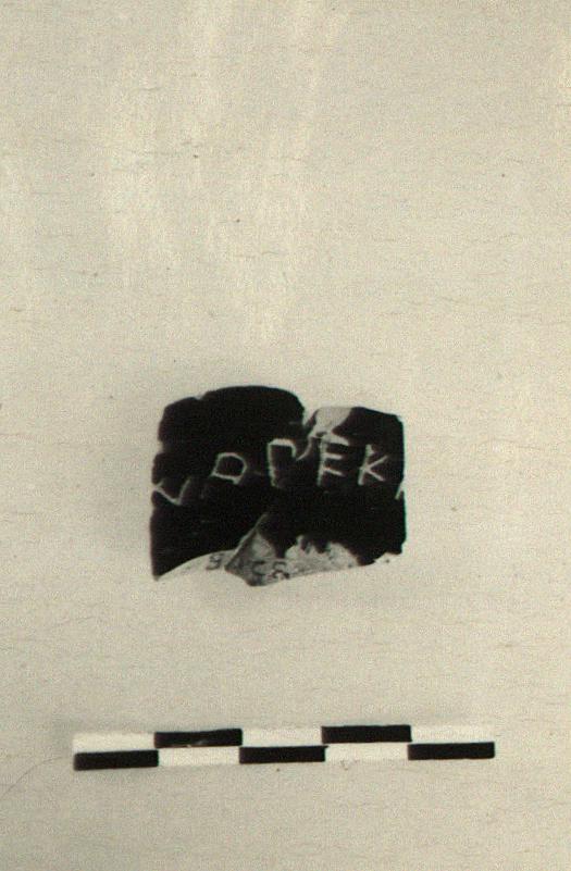 | Description: | Two joining fragments from the floor of a black glazed kylix. Incised outside: <graphic> | |