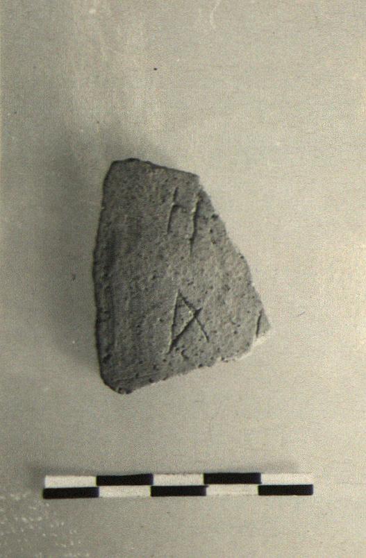 | Description: | Wall fragment from cooking ware pot. Incised outside: <graphic> Thin very sandy fabric, light red to gray with light buff surface. | |