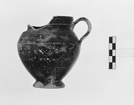 Description:   About three-quarters of the rim missing and one handle. For the shape cf. P 1820, of which this is a smaller version, made however of pinkish buff clay and covered with black glaze, thin and mottled but not much flaked. The resting surface of the flaring ring foot unglazed. At the line of the lower handle attachment, a wheel-run groove in which are small traces of white over the glaze.