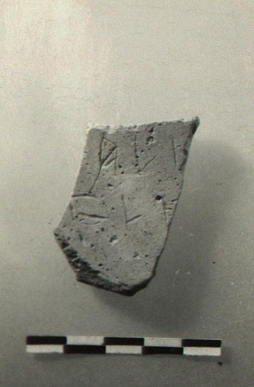 | Description: | Fragment of plain amphora. Incised inside: <graphic> Coarse pink clay, pale buff surfaces. | |