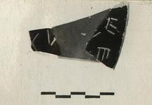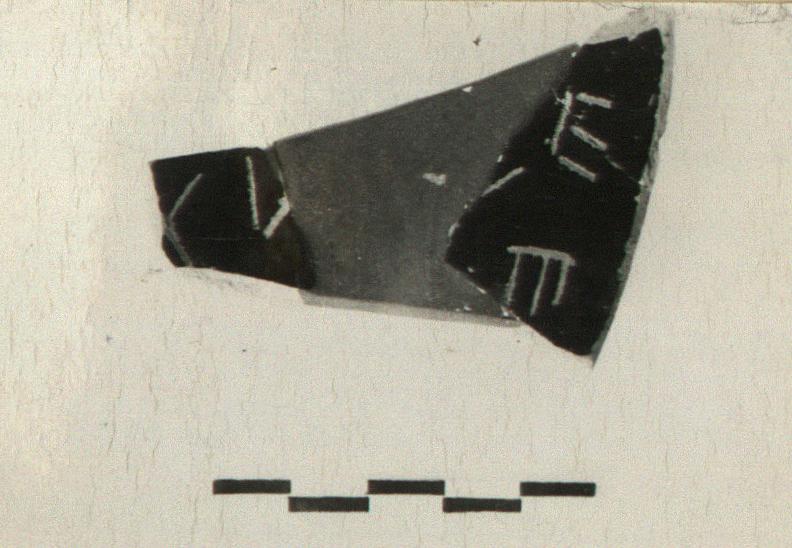 Description:   Two joining and one non-joining fragment from the floor of a black glazed kylix, put together with plaster.