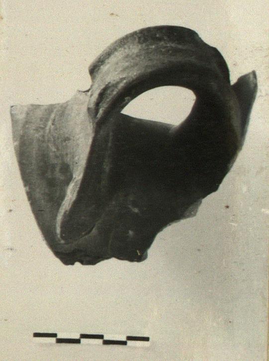 | Description: | Fragment of neck and shoulder, with short vertical strap handle. Graffito under handle: P I B Brown micaceous clay, black at the surface. | |