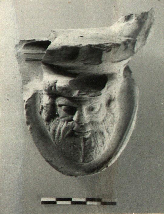 | Description: | Part of the rim preserved, with the large projecting lug, and the start of one end of a basket handle. Supporting the lug, a large bearded head. Dull pink clay; light buff slip over all; somewhat worn inside. | |