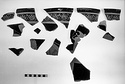 | Description: | Made up from: ΝΝ 3279, ΝΝ 4482, ΠΠ 754. From the wall of a calyx krater. Preserved is part of the interior of a shield, with a tassel from the cords, and part of the arm band, this decorated with pairs of figures painted in silhouette. To the right, part of the bearer of the shield, or of some other object. Careful work; glaze wash for the shield interior. From a large battle scene. A) Achilles mourning. B) Battle scene. a) ΝΝ 3279 + ΝΝ 4482 k. Shield. b) Mended from four pieces; rim. c) Rim. d) Lower rim and wall. e) Bit of rim ornament. f) Mended from three pieces; raised arm and shield rim or helmet crest. g) Lower edge of rim with helmet crest(?). h) Draped bearded figure. Raised dots for the beard. i) Speckled object; upper torso of woman(?). j) Seated youth. Gives the head, right arm and shoulder and a little of the legs of a youth seated left, his head bent to his breast, his forehead supported by his raised right hand. A cloak is drawn up over the back of his head, and its folds pass across his right arm. The hair is bound by a purple fillet, the locks above the brow indicated in raised black dots. k) ΠΠ 754. Mended from two pieces. Firm relief contour; lustrous glaze. Also fragments l) (ΝΝ 4971) and m), rim fragments. | |