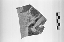 | Description: | Mended from three pieces; from the wall of a calyx krater; firm black inside. Part of a draped standing male figure, right, holding a lyre. In front of him the arm and hand of one holding a drawn sword. Probably Theseus and the Minotaur. Careful work; dilute glaze for details. | |