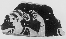 | Description: | Preserved is the head and shoulders of a dancing female figure, her left arm upraised. A bit of another figure at the right edge of the fragment. The iris of the eye appears to be outlined in red. Probably it was painted in black, and the red which now appears is the red wash (of which traces appear on the other reserved portions), preserved here by the glaze drawing which has for the most part peeled off at this point. | |