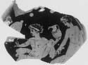 Description:   Mended from three pieces; from the wall of a small oinochoe of Shape III. Youthful male figure, nude, seated left on a cloak which is flung over his outstretched left arm; on the palm of his left hand he holds a large wreathed jug; his right hand is extended towards the figures approaching him from the left: two women, the first with a tympanum, the second (bit of hair only) with a torch. Behind him, a youth with cloak over left arm and torch in left hand, moves right, looking back left. White for the women's flesh; added clay for their ornaments, and for the fillets of the two youths; also for berries of the wreath around the neck of the pot, of which a small part remains. The added clay ornaments once gilded: a fleck of gilding remains on the fillet of the seated figure.