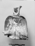 | Description: | The base, made separately, missing; the handle and much of the mouth broken away; also the tip of the dolphin's tail. The back plain, rounded, topped with an ordinary lekythos mouth and handle, these and the shoulder glazed black, as also the mid-part of the back. The front, moulded, shows a youthful male figure, winged, and crowned with a large wreath, seated sidewise on a dolphin. Long curls hang over his shoulders. Firm white slip, with over-painting in colors: blue on wings, red on the dolphin, yellow on the hair. Pinkish-buff clay. | |