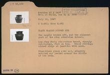 Description:   The handle broken off, and the adjacent part of the rim; otherwise intact. Low ring foot; rim rather broad, sharply out-turned, flat on top. Broad ribbing; nicked ridge at junction with neck.