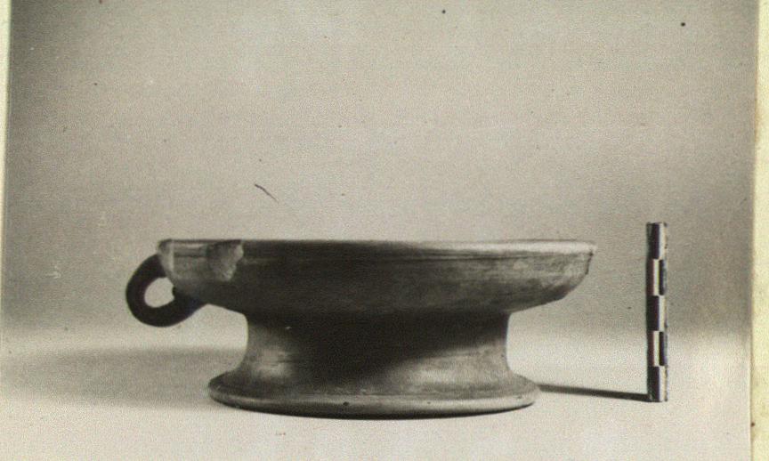 | Description: | One handle missing and chips, otherwise intact. Very shallow bowl with rim like that of a one-handler, set on a broad flaring base; on the bottom of the bowl, inside the base, a small ring like a foot ring. On either side, just below the rim, a vertical loop handle, very small, and rather carelessly made and smeared on. Two pairs of concentric grooves around a central circle, on the floor; a groove also at the edge of the base. Glazed over all with dilute glaze wash which has fired a light orange; a few streaks of black underneath. Glaze worn, especially on floor and on resting surface. | |