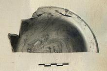 | Description: | Mended from several fragments; about half preserved. Shallow bowl with plain rim, flat floor with slightly rising center, and ring foot. Stamp at center of floor partly preserved. Hard dark red clay. Very firm yellow glaze streaked (marbled) with red. | |