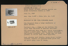 | Description: | Rim fragment from a large kantharos or small krater. Vertical rim, a ridge at its bottom; its upper edge finished in shallow scallops. Rim separated from body by a broad indentation, almost a short neck. Below, narrow shoulder, and gently rounding wall. Large egg and dart pattern in relief just below shoulder. Pale pinkish-buff fabric; brown glaze inside; outside, remains of greenish-blue glaze and of white slip; also of brown. | |