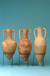 | Description: | Complete save minor chips; one handle broken and mended. Tall neck with rolled rim; horned handles, shoulder to below rim. Slender elongated eggy body, tapering to pointed toe. Buff to pinkish clay; light buff slip. | |