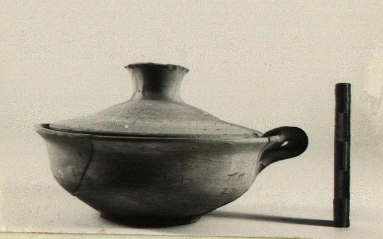 Description:   Lid and pot mended from several pieces; a small piece missing from the edge of the lid, and chips from rim and floor of pot. Open pot on low raised base; flaring rim flanged inside to hold the lid; single small vertical band handle at the rim. Plain slightly sloping lid with large knob, flat on top. Similar to P 18476 (ΠΠ 272).