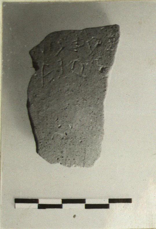 | Description: | From the wall of a coarse unglazed amphora. Incised outside: <graphic> Micaceous brick red clay with orange surfaces and white bits. | |