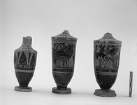 | Description: | Mouth and handle missing; minor chips. Foot in two degrees; on the shoulder double rays; double row of dots above scene. On the body, quadriga right. Behind the horses, one standing with a harp; and another. In front of the horses, another figure. Tendrils in field. Ample added red and white. | |