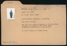 | Description: | The mouth missing. The foot in a single degree; on the shoulder, tongues and blobs; on the body, three palmettes, separated by long petals. No clear remains of added color. | |