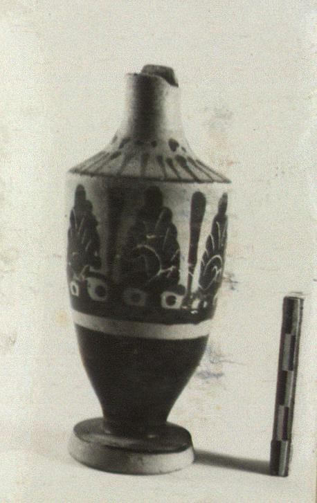 | Description: | The mouth missing. The foot in a single degree; on the shoulder, tongues and blobs; on the body, three palmettes, separated by long petals. No clear remains of added color. | |