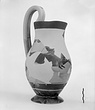 | Description: | Put together from many pieces; the profile can be restored complete except for the edge of the lip. Oinochoe type I: echinus foot; broad ovoid body forming a continuous curve with the wide neck; trefoil mouth; double rolled handle. Large reserved and figured panel at one side; on the other side, near the handle, two reserved triangles. Panel bordered above by a band of lotus and palmette, double and alternating, above a row of incised rosettes: both patterns with alternating red and black petals; white dots between the tips of the rosette petals. In the panel, horse and rider galloping right. The rider wears a jerkin with short sleeves and a waist-length overdress(?) the hem of which floats out over the horse's back. The garments are purple, their broad hems black, ornamented with incision and with rows of white dots along the edges. Purple also for the horse's belly and hooves. Fine fabric; excellent glaze. The neck glazed inside; the handle reserved and decorated with stripes of brown. Very careful incision. | |